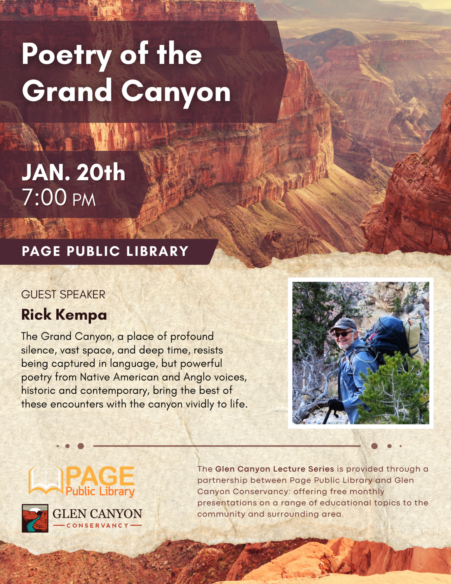 Glen Canyon Lecture Series - Poetry of the Grand Canyon Location Page Public Library 479 S. Lake Powell Blvd., Page AZ, 86040 Date January 20, 2026 Time 7:00 PM to 8:00 PM Department Page Public Library Category Adult's Calendar Description |