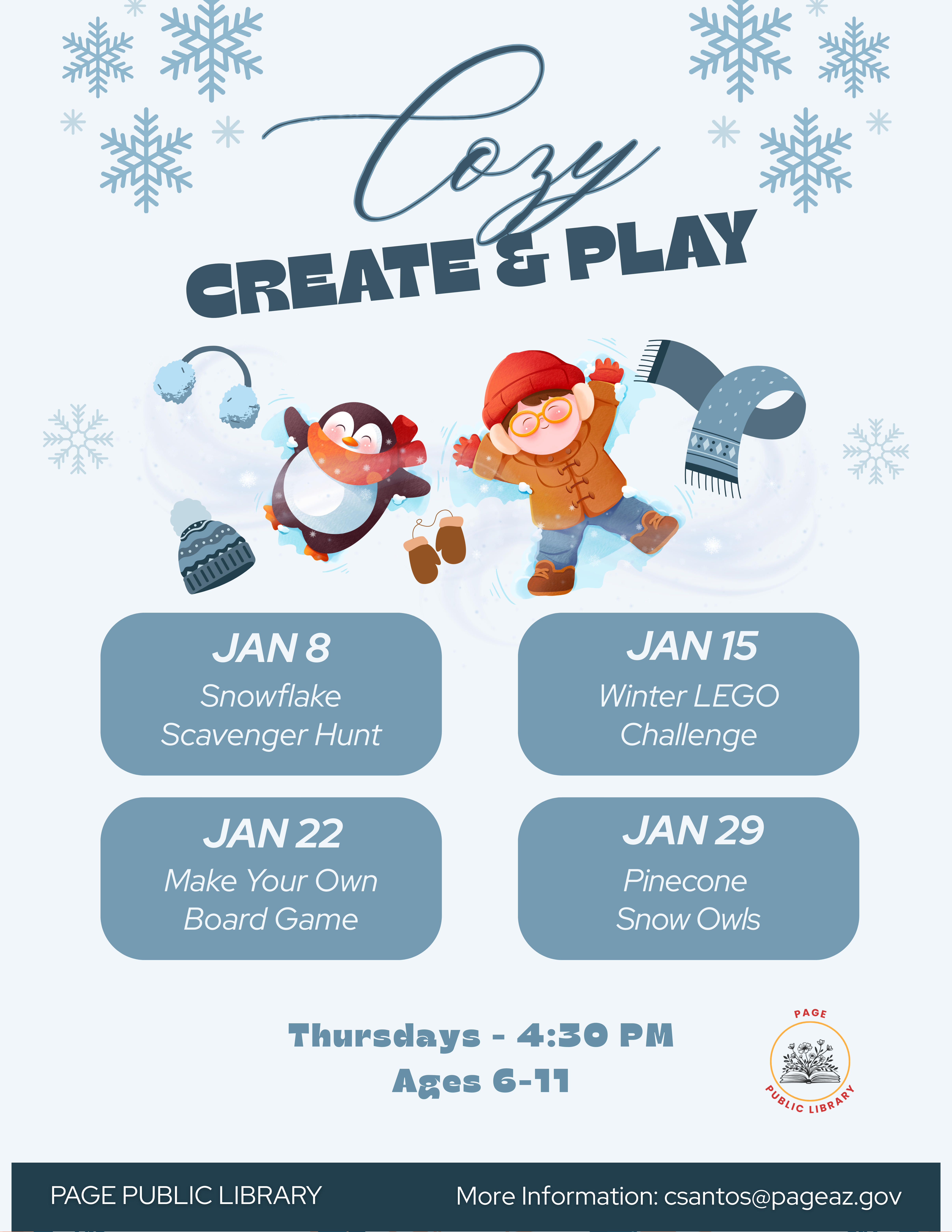 Children's - Winter LEGO Challenge Location Page Public Library 479 S. Lake Powell Blvd., Page AZ, 86040 Date January 15, 2026 Time 4:30 PM to 5:30 PM Department Page Public Library Category Children's Calendar Description |