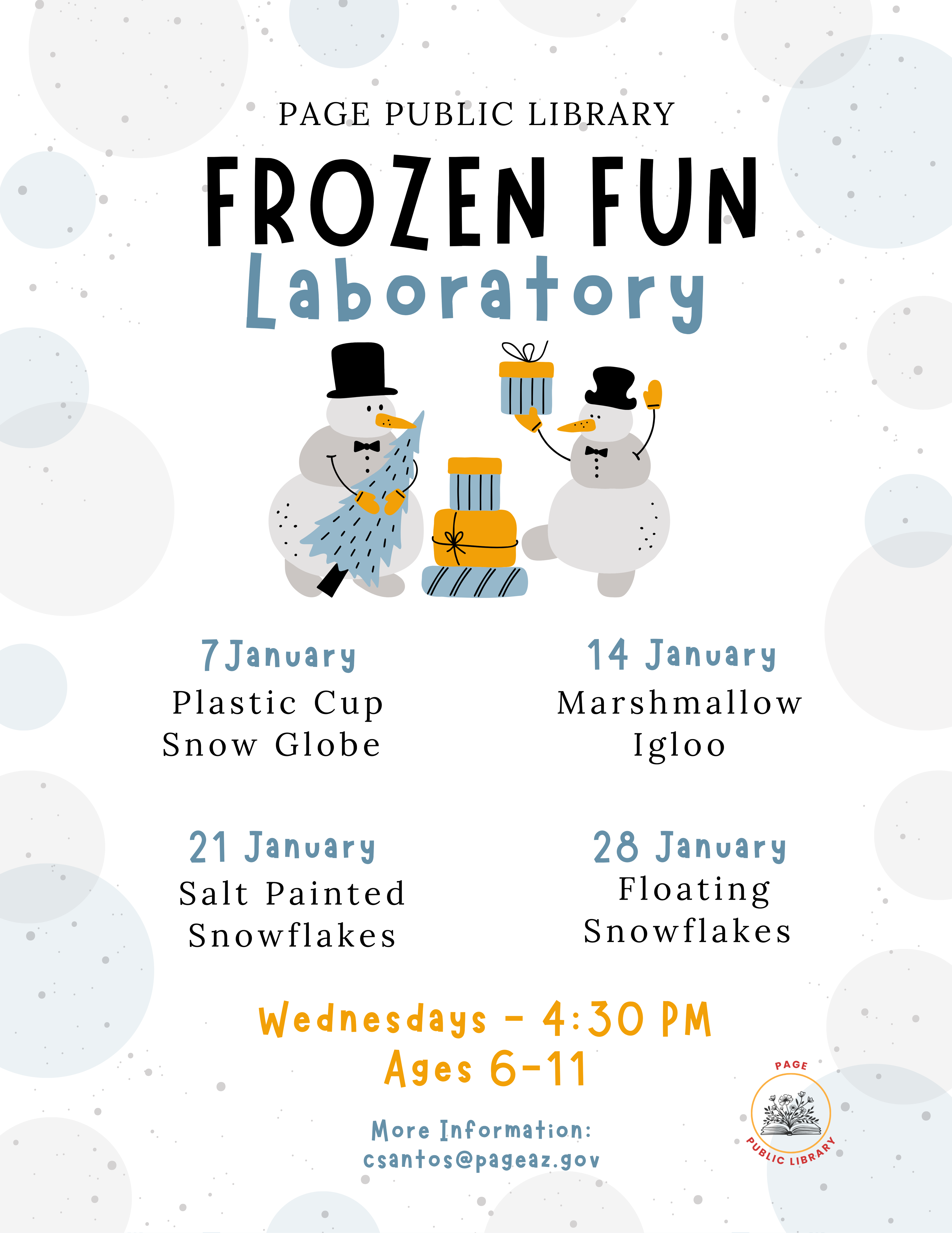 Children's - Salt Painted Snowflakes Location Page Public Library 479 S. Lake Powell Blvd., Page AZ, 86040 Date January 21, 2026 Time 4:30 PM to 5:30 PM Department Page Public Library Category Children's Calendar Description |