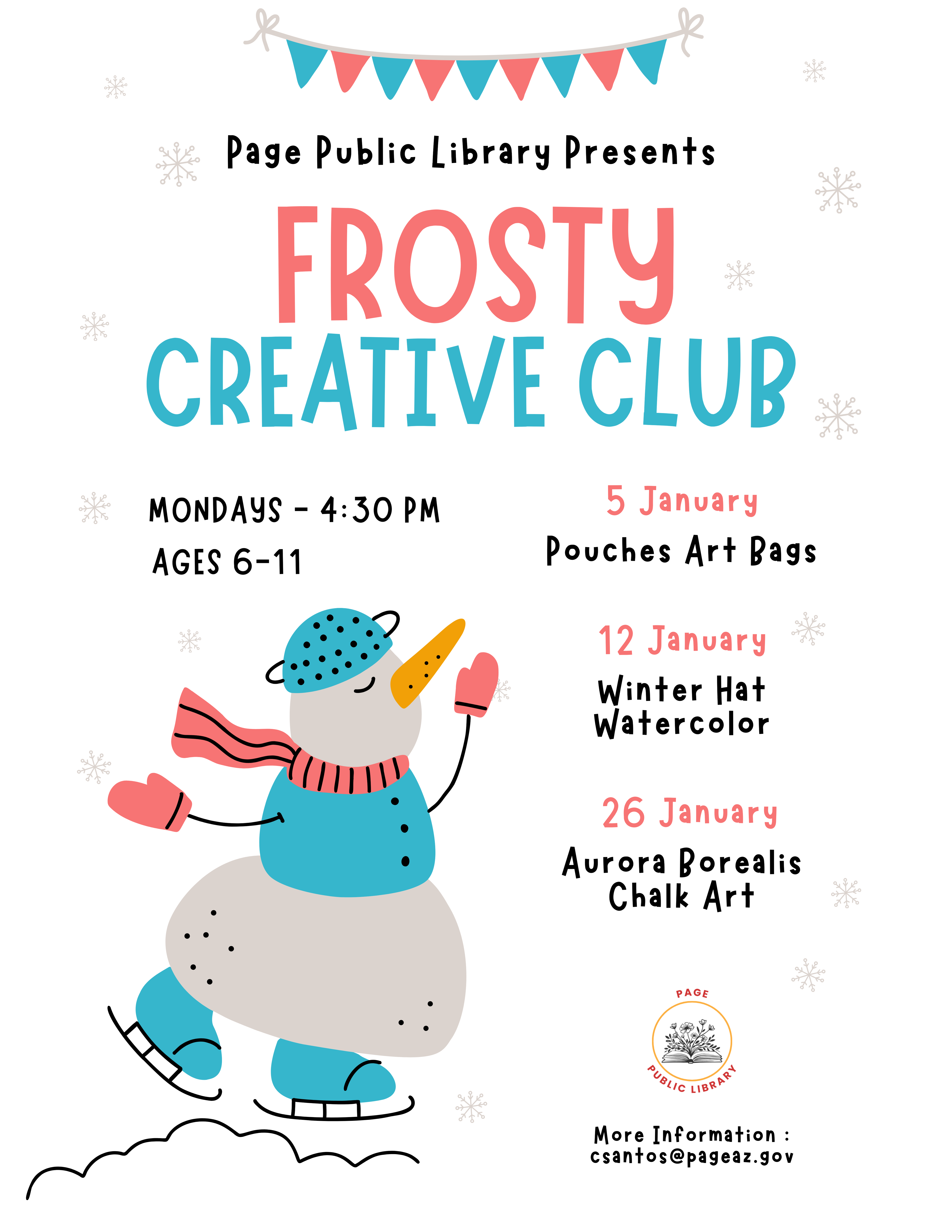 Children's - Aurora Borealis Chalk Art Location Page Public Library 479 S. Lake Powell Blvd., Page AZ, 86040 Date January 26, 2026 Time 4:30 PM to 5:30 PM Department Page Public Library Category Children's Calendar Description |