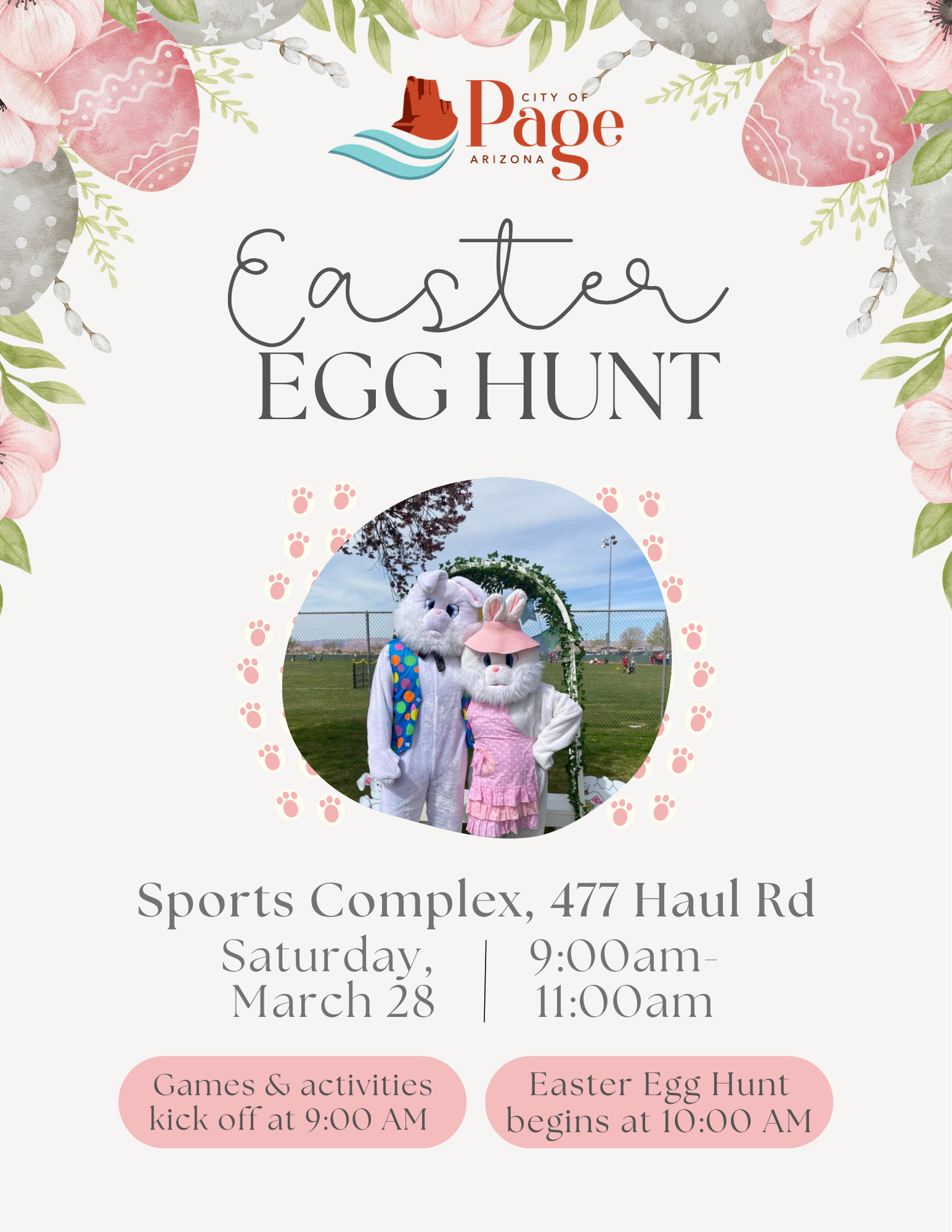 2026 Easter Egg Hunt Location Page Sports Complex 477 Haul Road, Page AZ, 86040 Date March 28, 2026 Time 9:00 AM to 11:00 AM Department Special Events Description The annual Easter Egg Hunt is coming up on Saturday, March 28! Join us at the Sports Complex starting at 9am for activities before the hunt at 10am. Volunteers can reach out to events@pageaz.gov for more information. |