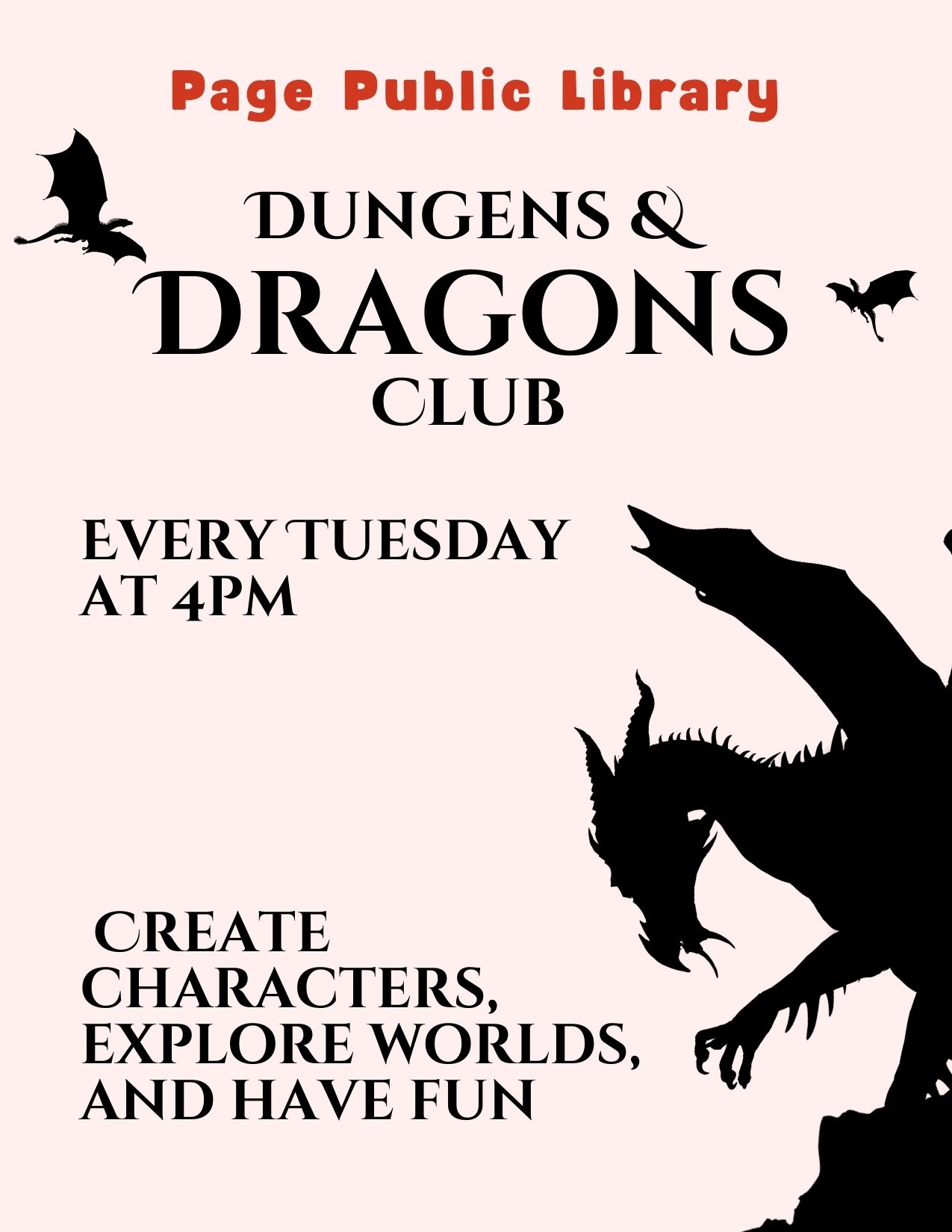 Teen's D&D Club Location Page Public Library 479 S. Lake Powell Blvd., Page AZ, 86040 Date February 10, 2026 Time 4:00 PM to 5:30 PM Repeat Weekly Department Page Public Library Category Teen's Calendar Description |