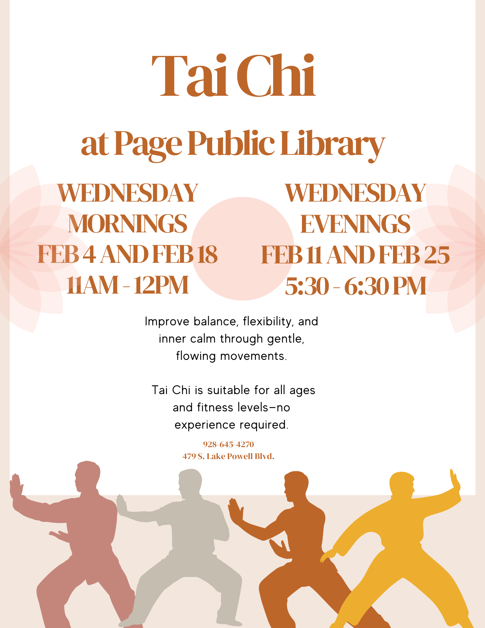 Adult Tai Chi Location Page Public Library 479 S. Lake Powell Blvd., Page AZ, 86040 Date February 11, 2026 Time 5:30 PM to 6:30 PM Repeat Bi-Weekly Department Page Public Library Category Adult's Calendar Description |