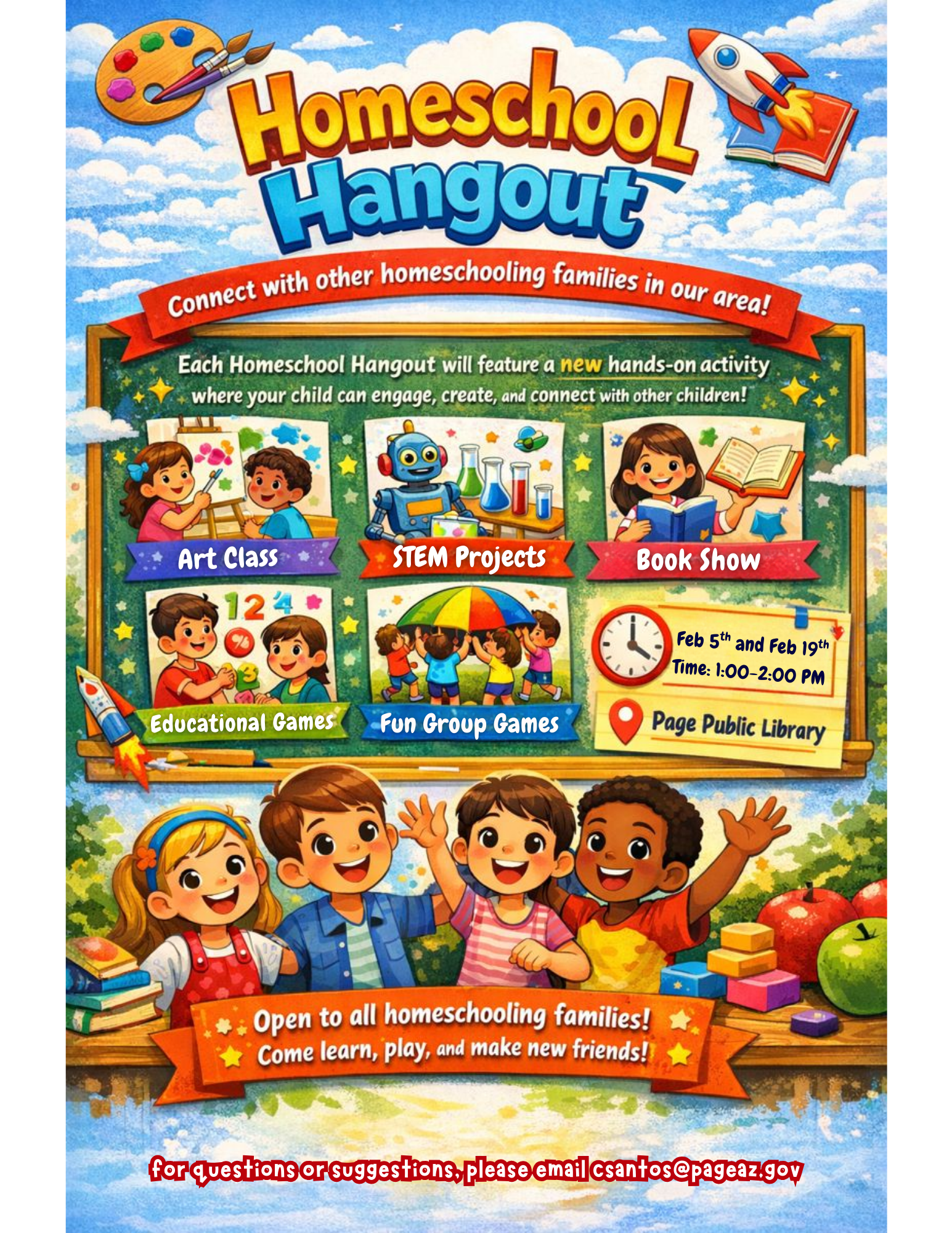 Children's - Homeschool Hangout Location Page Public Library 479 S. Lake Powell Blvd., Page AZ, 86040 Date February 19, 2026 Time 1:00 PM to 2:00 PM Repeat Bi-Weekly Department Page Public Library Category Children's Calendar Description |