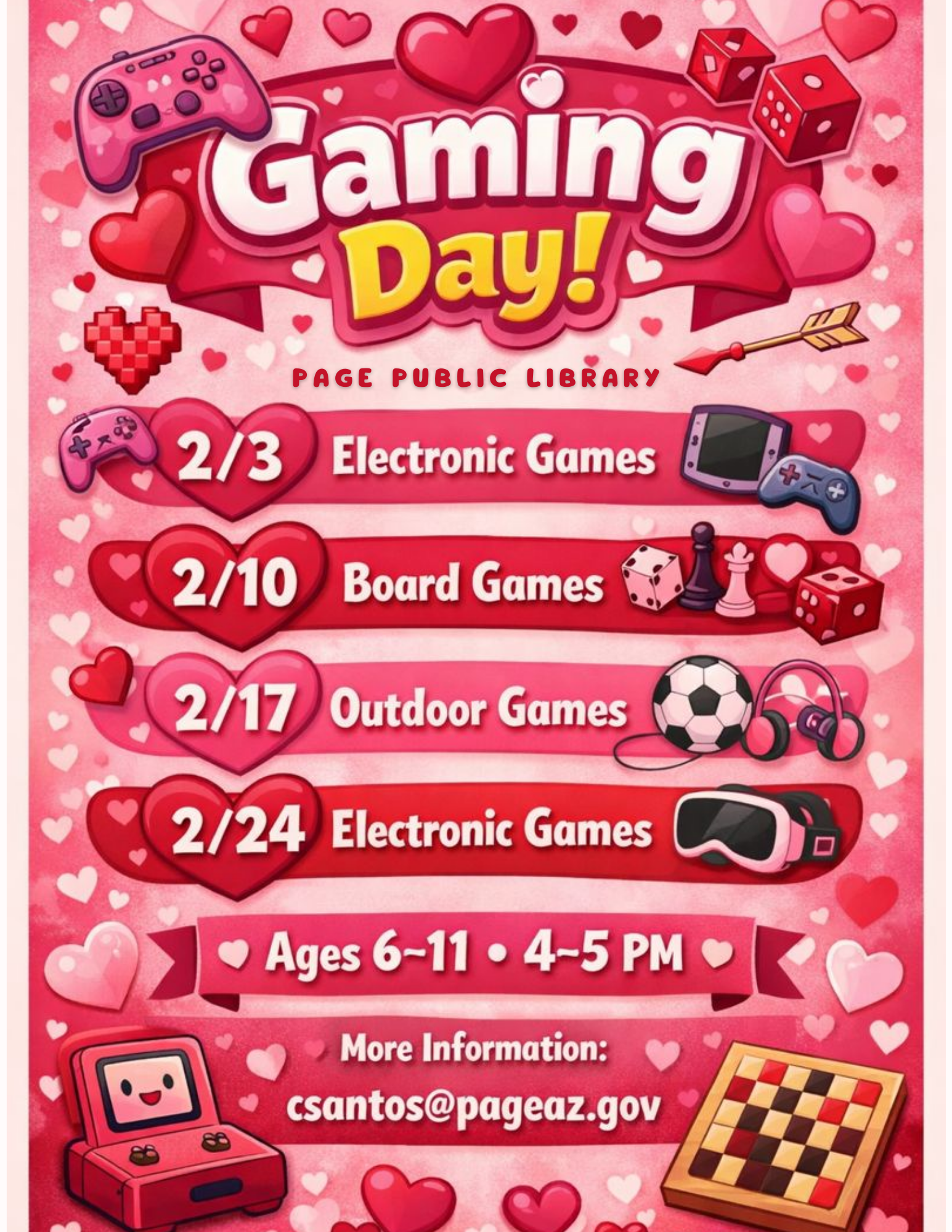 Children's After School Program - Electronic Games Location Page Public Library 479 S. Lake Powell Blvd., Page AZ, 86040 Date February 03, 2026 Time 4:00 PM to 5:00 PM Department Page Public Library Category Children's Calendar Description |