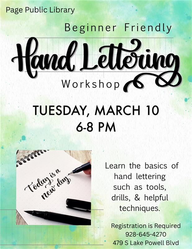 Adult's - Hand Lettering Workshop Location Page Public Library 479 S. Lake Powell Blvd., Page AZ, 86040 Date March 10, 2026 Time 6:00 PM to 8:00 PM Department Page Public Library Category Adult's Calendar Description |