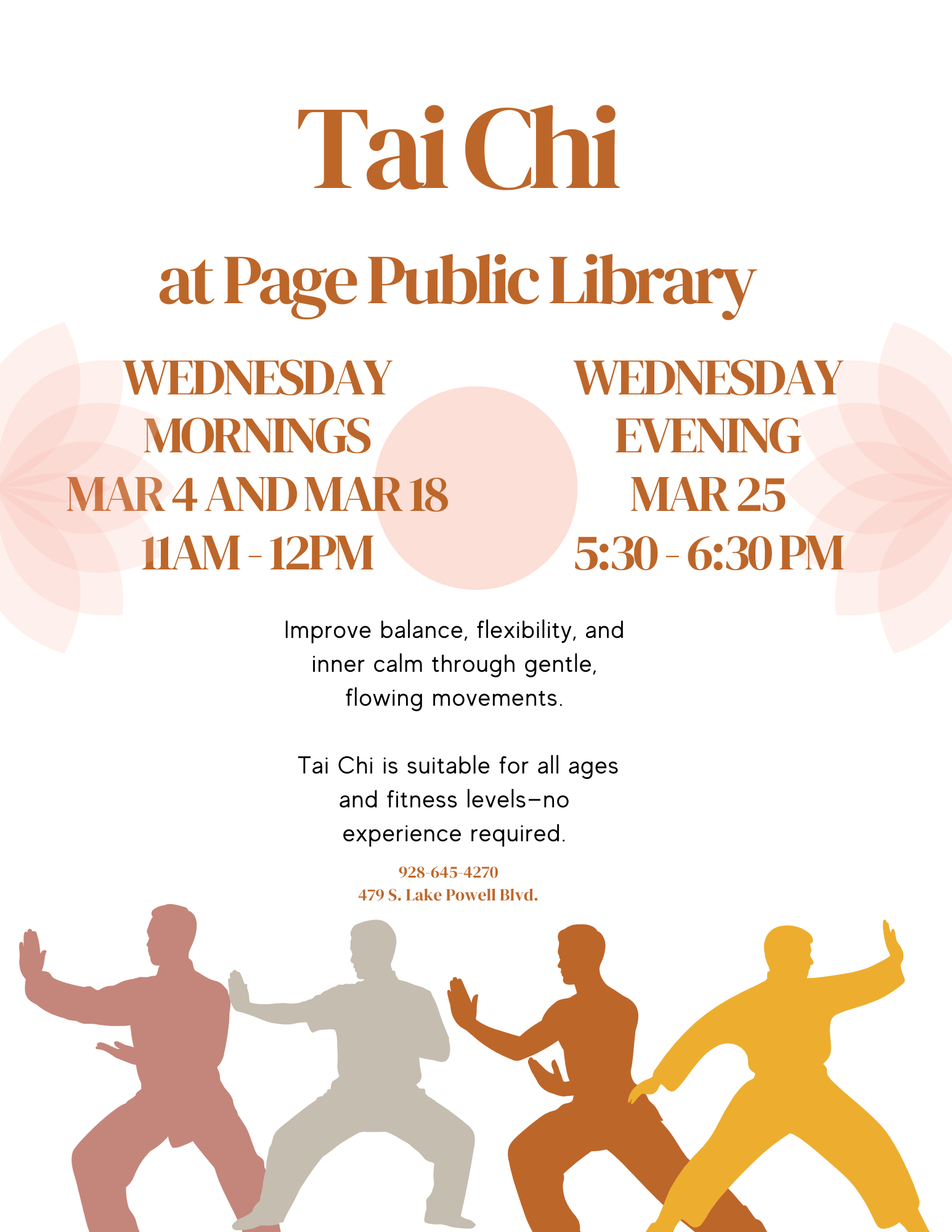 Adult Tai Chi Location Page Public Library 479 S. Lake Powell Blvd., Page AZ, 86040 Date March 25, 2026 Time 5:30 PM to 6:30 PM Department Page Public Library Category Adult's Calendar Description |
