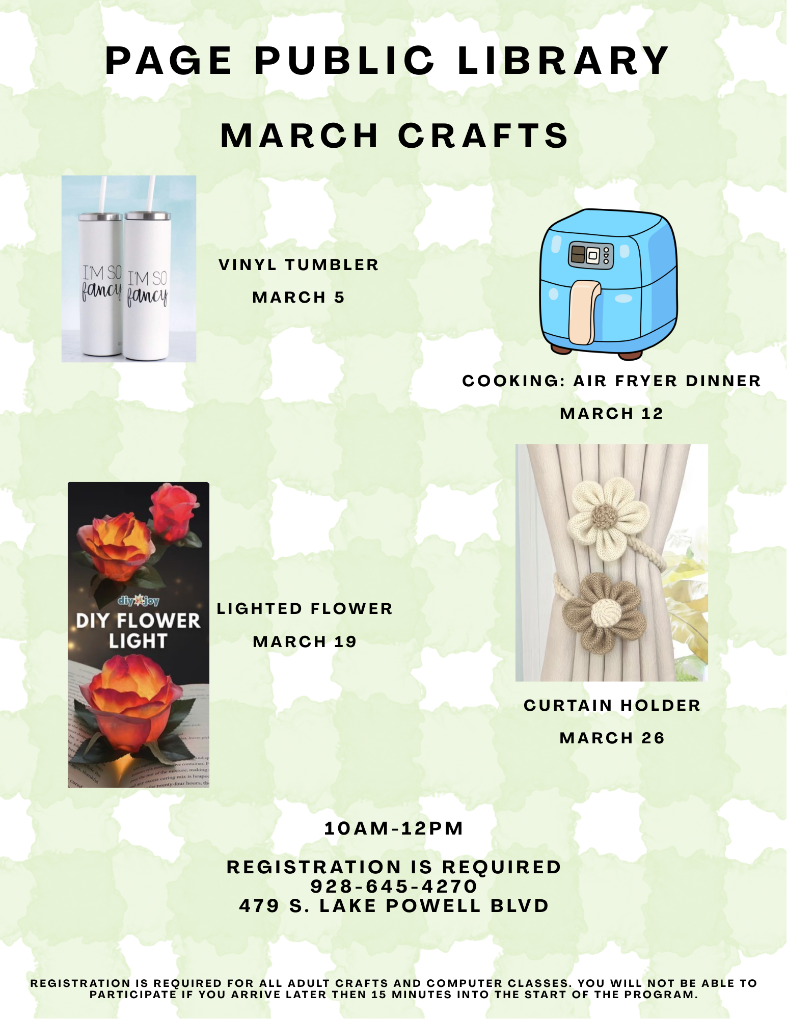Adult Craft - Curtain Holder Location Page Public Library 479 S. Lake Powell Blvd., Page AZ, 86040 Date March 26, 2026 Time 10:00 AM to 12:00 PM Department Page Public Library Category Adult's Calendar Description |