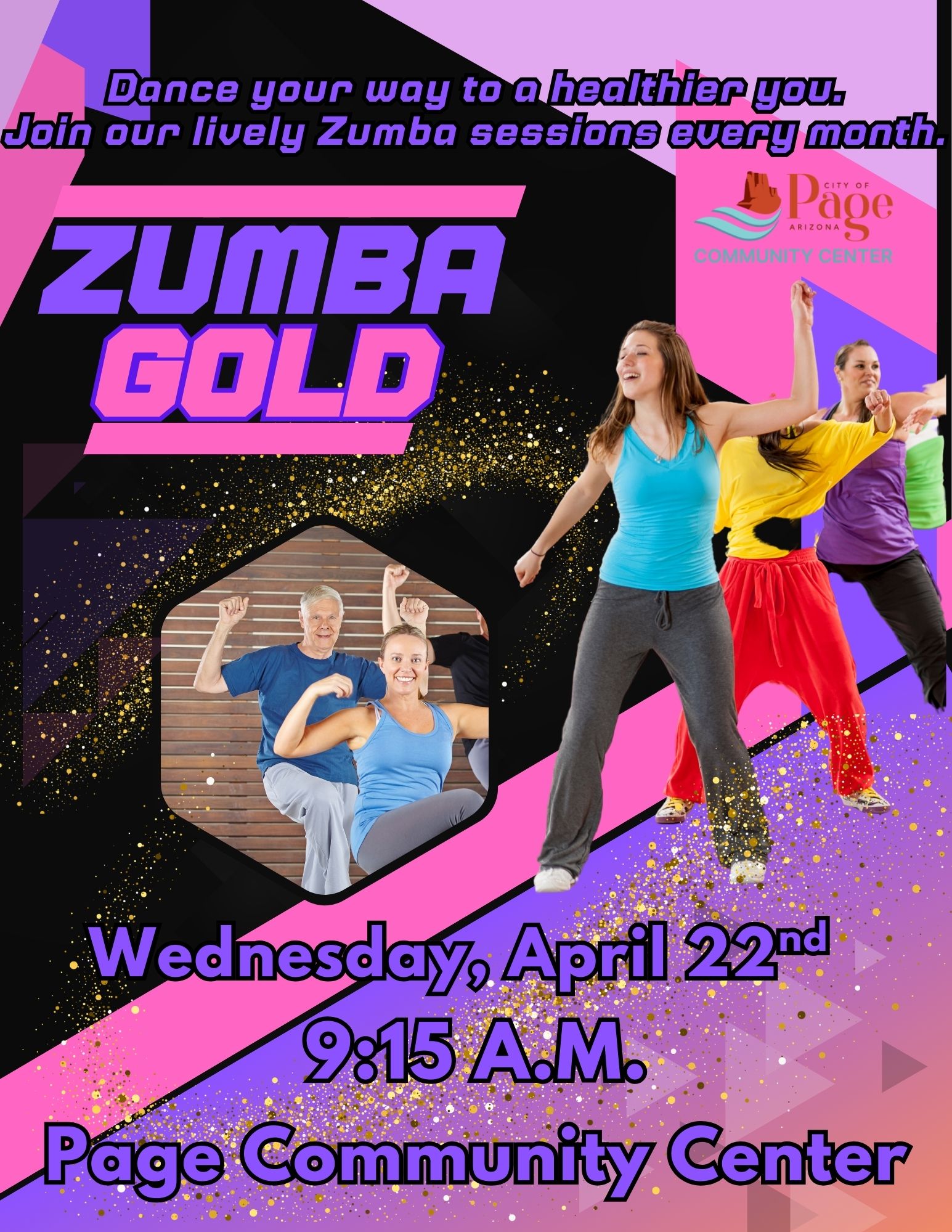 Zumba Gold is Back! Location Page Community Center 699 S. Navajo Dr., Page AZ, 86040 Date April 22, 2026 Time 9:15 AM to 10:45 AM Department Community Center Category Staying Active Description Tara will get you moving! Come see what fun you can have while joining her Zumba Gold class. Don't say I can't do that when you haven't come to see what it really is and how much fun you can have. Step , or dance, out odf your comfort zone and join us!!! |