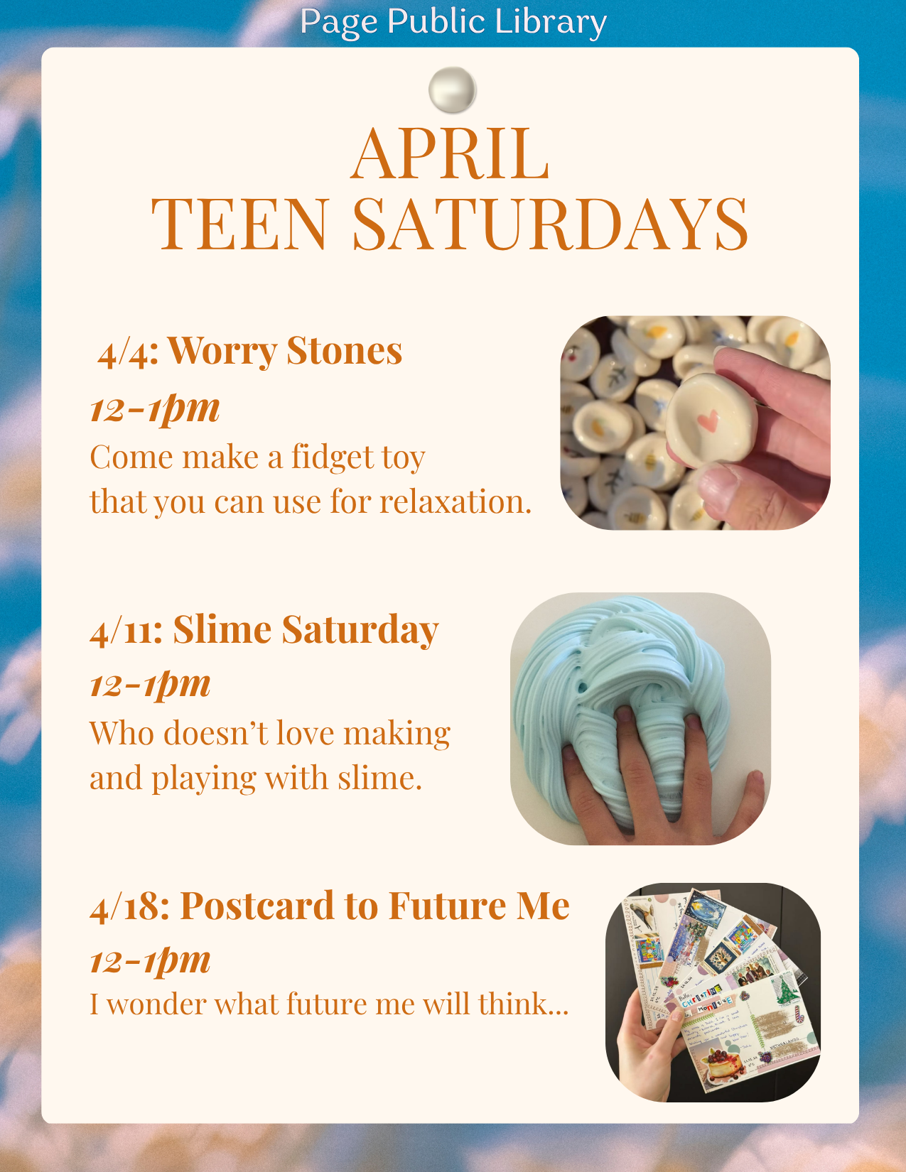 Teen's - Worry Stones Location Page Public Library 479 S. Lake Powell Blvd., Page AZ, 86040 Date April 04, 2026 Time 12:00 PM to 1:00 PM Department Page Public Library Category Teen's Calendar Description |