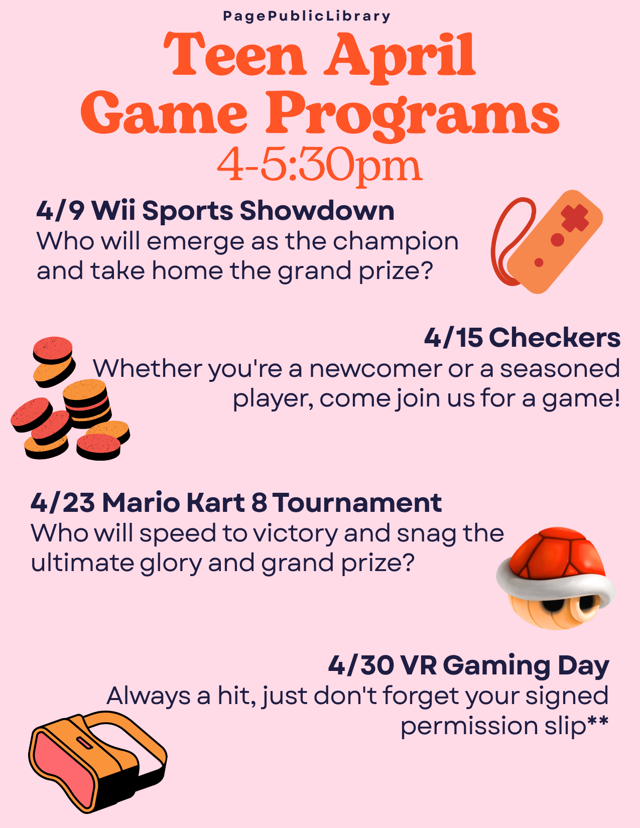 Teen After School Program - Mario Kart Tournament Location Page Public Library 479 S. Lake Powell Blvd., Page AZ, 86040 Date April 23, 2026 Time 4:00 PM to 5:30 PM Department Page Public Library Category Teen's Calendar Description |