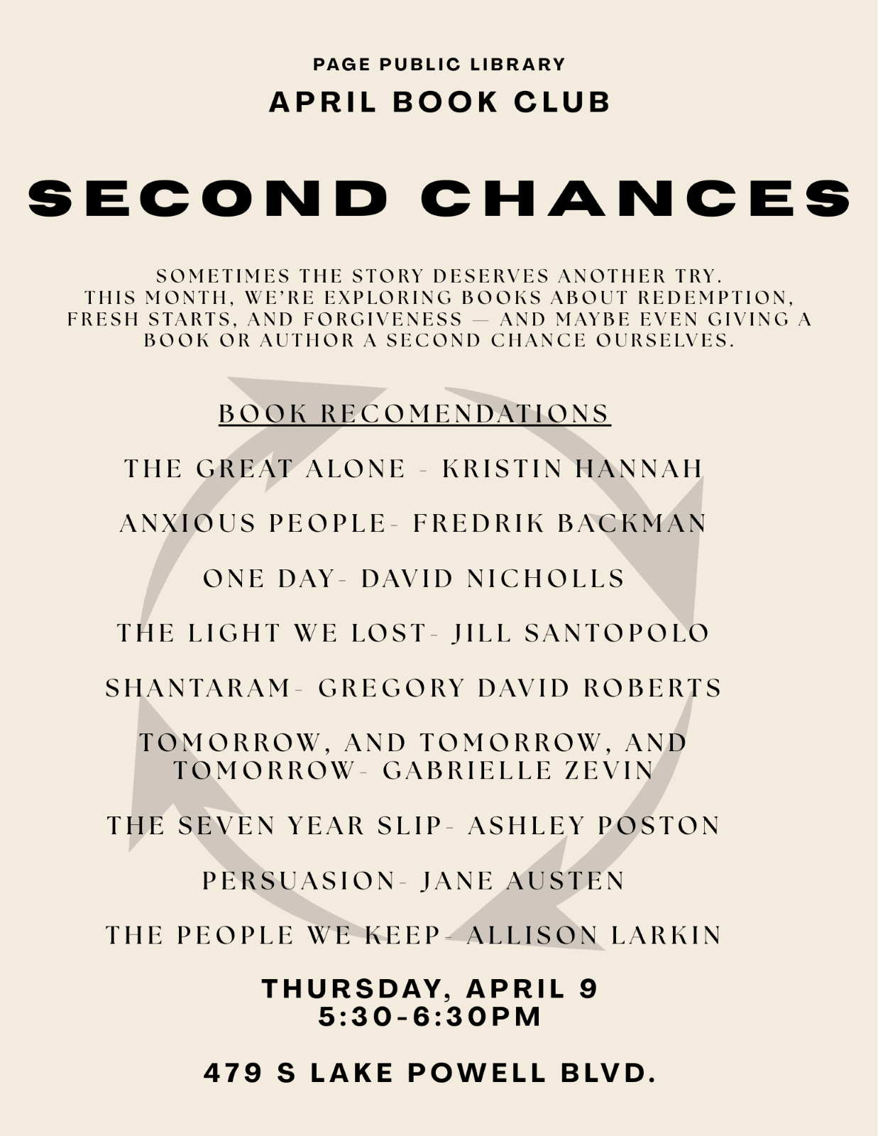 Adult Book Club - Second Chances Location Page High School 434 S Lake Powell Blvd., Page AZ, 86040 Date April 09, 2026 Time 5:30 PM to 6:30 PM Department Page Public Library Category Adult's Calendar Description |